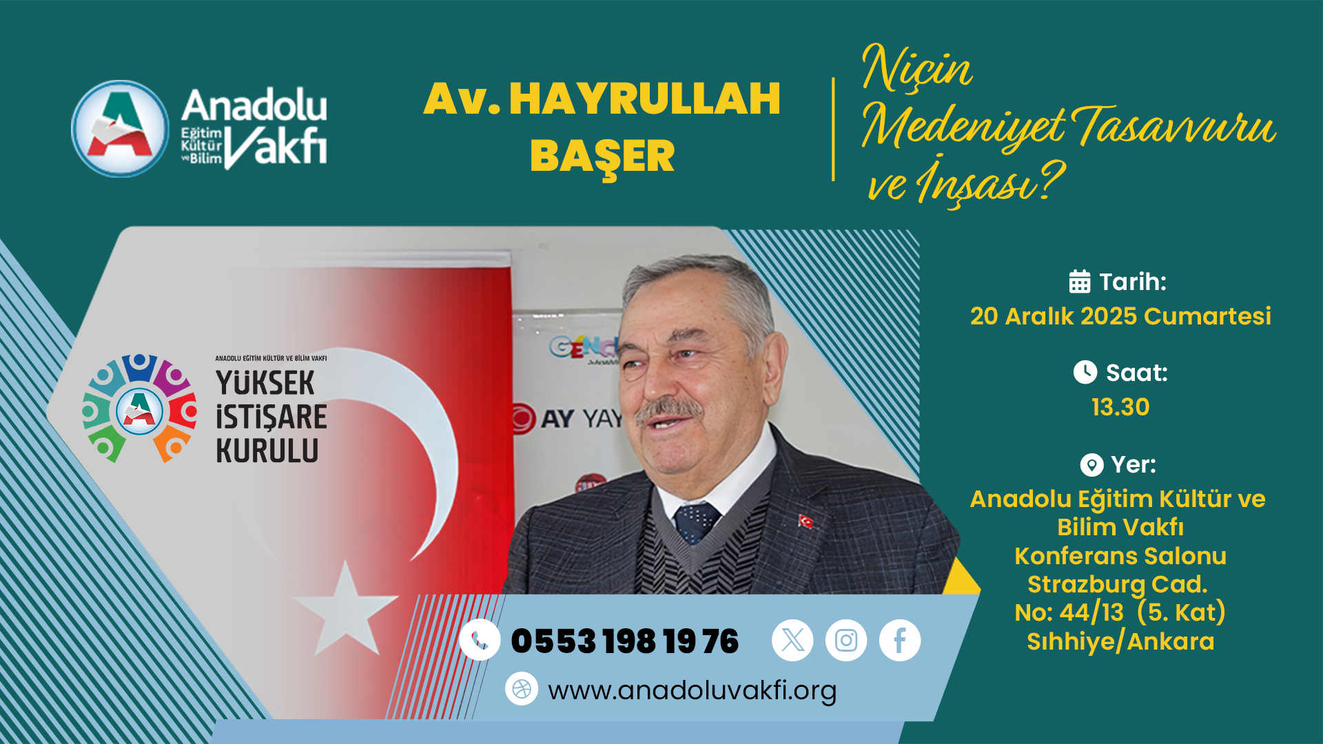 Av. Hayrullah Başer’den “Niçin Medeniyet Tasavvuru ve İnşası?” Konferansı Bilindiği gibi Vakıf faaliyetlerimiz, “Medeniyet Tasavvuru ve İnşası” düşüncesi temelinde yürütülmektedir. Medeniyet bakış açılı düşünce ve faaliyetin anlam ve önemini ortaya koymak bakımından bu toplantıda; Mütevelli Heyet Başkanı ve Vakfımızın Yüksek İstişare Kurulu üyesi Av. Hayrullah Başer’in sunacağı “Niçin Medeniyet Tasavvuru ve İnşası?” konulu konferansa tüm […]