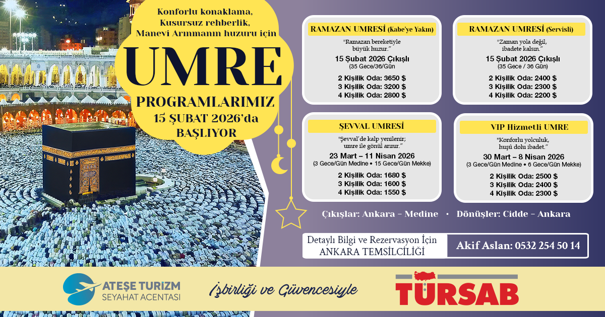 2026 Yılı Umre Programları Başlıyor Konforlu konaklama, Kusursuz rehberlik, Manevi Arınmanın huzuru için UMRE PROGRAMLARIMIZ15 ŞUBAT 2026’da BAŞLIYOR Çıkışlar: Ankara – Medine • Dönüşler: Cidde – Ankara RAMAZAN UMRESİ (Kabeye Yakın)“Ramazan bereketiyle büyük huzur” 15 Şubat 2026 Çıkışlı (35 Gece/36/Gün2 Kişilik Oda: 3650 $ 3 Kişilik Oda: 3200 $ 4 Kişilik Oda: 2800 $ RAMAZAN […]