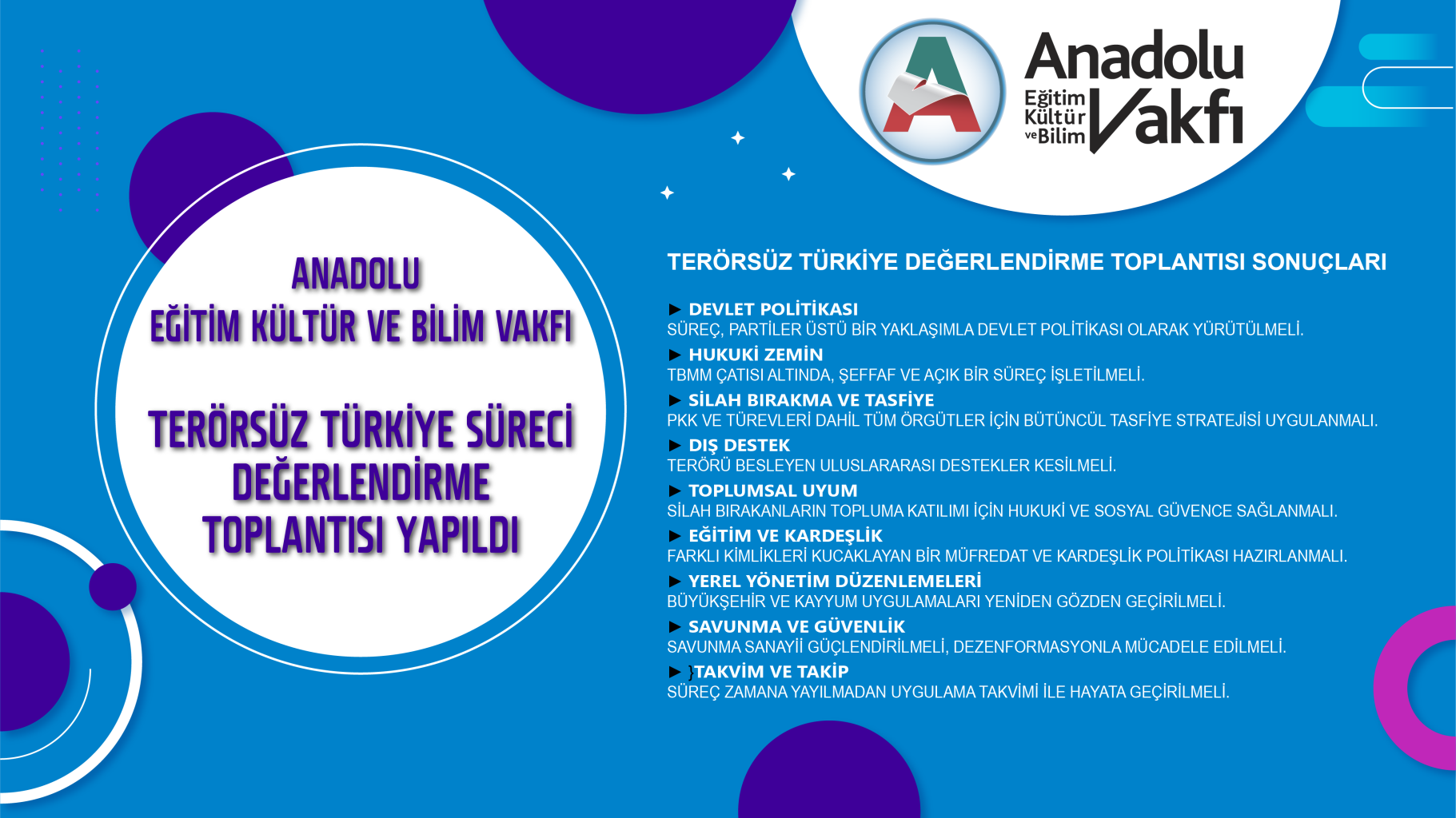 Anadolu Eğitim Kültür ve Bilim Vakfı “Terörsüz Türkiye Süreci Değerlendirme Toplantısı” Tutanağı Yayınlandı ANADOLU EĞİTİM KÜLTÜR VE BİLİM VAKFI “Terörsüz Türkiye Süreci Değerlendirme Toplantısı” Tutanağı TARİH – YER : 20.08.2025 – Anadolu Eğitim Kültür ve Bilim Vakfı Toplantı Salonu KATILIMCILAR : Hayrullah Başer, Necmettin Turinay, Hilmi Demir, Mustafa GÜLER, Mahmut ÖZBAY, Recep KIRIŞ, Şazeli ÇÜGEN, Ali AY, Mehmet ÖZTÜRK, Abidin MEMİLİ, Raif AK AÇILIŞ-GİRİŞ Türkiye’nin temel gündemlerinden biri olan “Terörsüz Türkiye” süreciyle ilgili konuyu müzakere […]