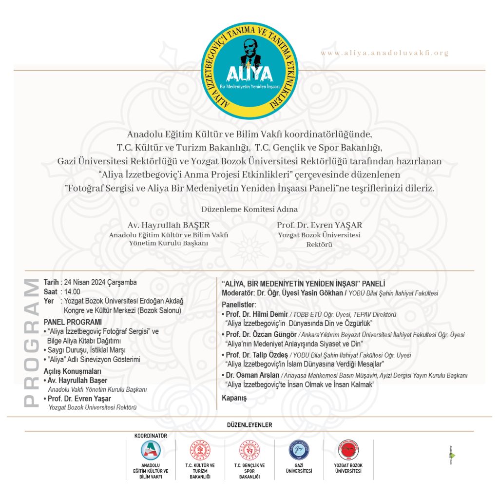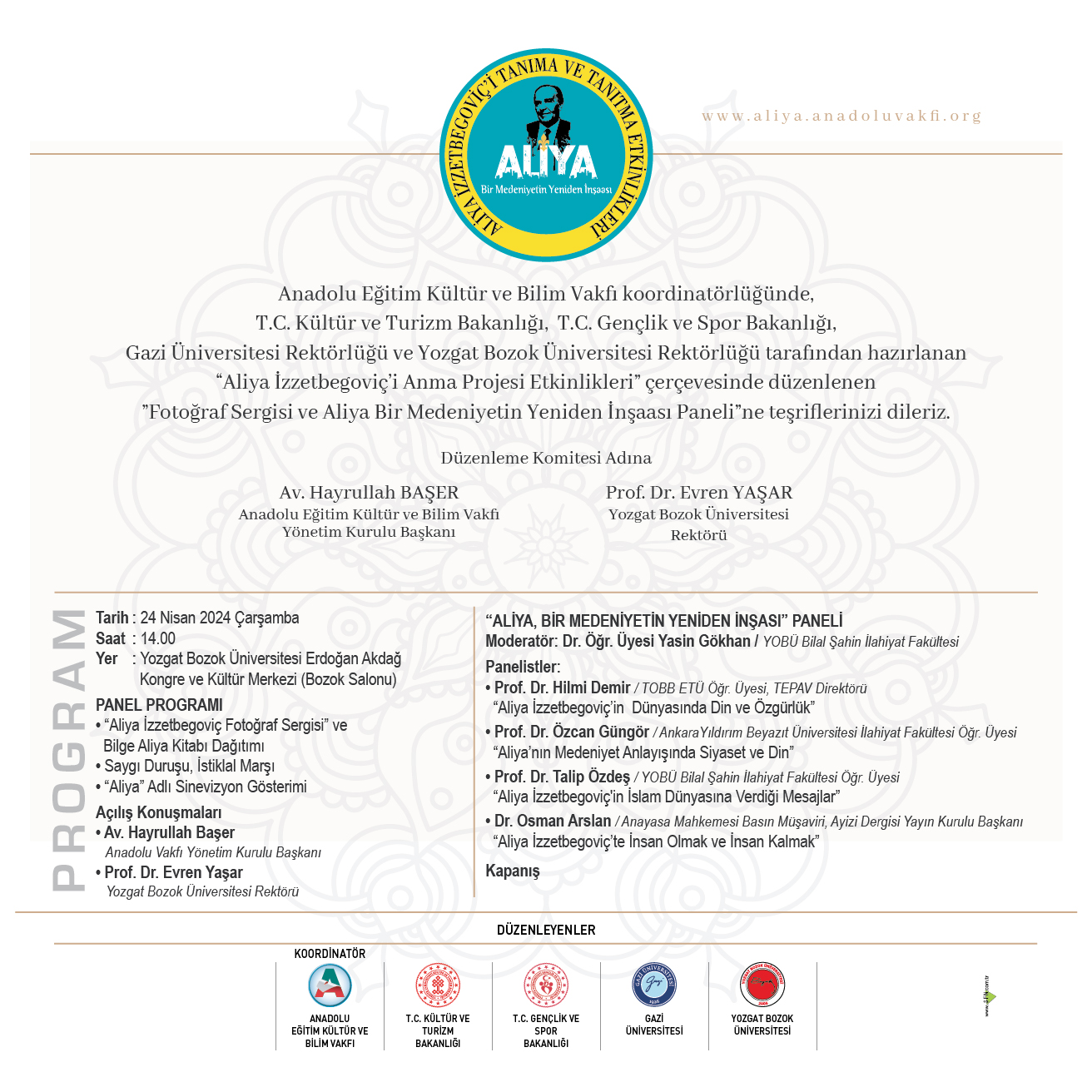 Anadolu Eğitim Kültür ve Bilim Vakfı koordinatörlüğünde, T.C. Kültür ve Turizm Bakanlığı, T.C. Gençlik ve Spor Bakanlığı, Gazi Üniversitesi Rektörlüğü ve Yozgat Bozok Üniversitesi Rektörlüğü iş birliğiyle hazırlanan, “Aliya İzzetbegoviç’i Tanıma ve Tanıtma Etkinlikleri” çerçevesinde düzenlenecek olan ”Fotoğraf Sergisi ve Aliya Bir Medeniyetin Yeniden İnşası Paneli” 24 Nisan 2024 tarihinde, saat 14.00’te Yozgat Bozok Üniversitesi Erdoğan Akdağ Kongre ve Kültür Merkezi (Bozok Salonu)’nde gerçekleştirilecek.